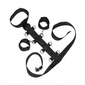 Преимуществами набора для фиксации являются:<br> <br> -Надежность. Для изготовления аксессуара применяются прочные, износостойкие и устойчивые к разрыву материалы. Крепкие ремни и металлические крепления способны выдерживать любые нагрузки.<br> <br> -Безопасность. Фиксатор имеет мягкую эластичную структуру, после их использования на теле не остается никаких следов.<br> <br> -Универсальность. Ошейник и наручники легко регулируются по обхвату при помощи застежек-липучек. Несколько колец на ленте, соединяющих ошейник и пояс, позволяют фиксировать наручники в 4-х положениях по высоте. Пояс-фиксатор на талию выполнен в виде ремня. Благодаря пряжкам Вы легко сможете отрегулировать аксессуар по необходимому Вам объему и длине, в зависимости от роста и размера. Ширина ошейника - 4 см., обхват - 31-41 см.<br> Ширина наручников - 5 см., обхват - 14-22 см.<br> Ширина пояса - 4 см.<br> Обхват талии - 60-120 см.<br> Ширина ленты с кольцами - 4 см.<br> Длина ленты с кольцами - 35-48 см. None