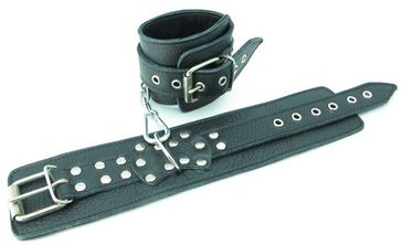 Оковы выполнены из натуральной кожи черного цвета. Декорированы заклепками и бантом с металлическим полукольцом. Оковы надежно фиксируются пряжками и ремнями, позволяющими выбрать нужный размер, подойдут на обхват от 18 до 27 см. Нежный подклад из перчаточной кожи обеспечивает комфорт, кожаное соединение на карабинах фиксирует оковы вместе. Аксессуар позволяет в полной мере насладиться сексом в стиле БДСМ. Ширина - 6 см. <br> Длина цепочки - 14 см. None