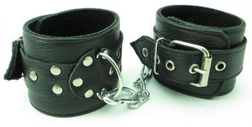 Наручники выполнены из натуральной кожи черного цвета. Изделие декорировано заклепками. По середине расположено полукольцо из сварной фурнитуры. Наручники надежно фиксируются пряжками и ремнями, позволяющими выбрать нужный размер, подойдут на обхват руки от 16 до 25 см. Кожаное соединение на карабинах фиксирует наручники вместе. Приятные для тела и стильные наручники отлично подходят для воплощения эротических БДСМ игр. Ширина - 6 см.<br> Длина соединения - 14 см. None