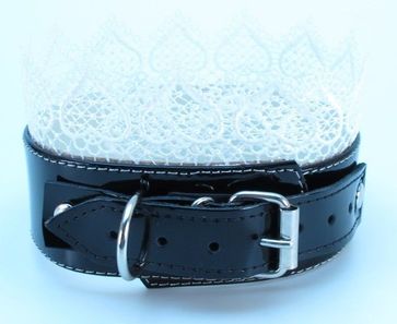 Ошейник выполнен из натуральной лакированной кожи черного цвета. Аксессуар декорирован белым кружевом. Ремень позволяет выбрать нужный размер, подойдет на обхват от 31 до 38 см. Металлическая пряжка надежно фиксирует. Подклад из нежной кожи обеспечивает комфорт. Нежный и страстный аксессуар станет отличным дополнение к Вашей БДСМ игре. Ширина кожаной части - 3,5 см. None