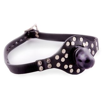 Черный кляп на ремне из искусственной кожи с головкой фаллоса с внутренней стороны для фиксации рта. Фаллос выполнен из мягкого качественного TPR. Кляп декорирован металлическими клепками. Длина ремешка регулируется от 44 см до 56 см.<br> Длина малого фаллоса - 4,7 см, диаметр - 3,5 см. None