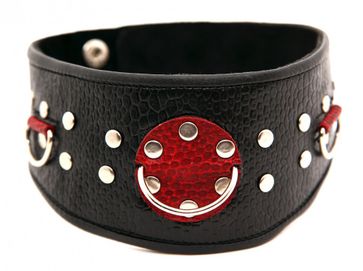 Ошейник с расширением впереди выполнен из качественной натуральной черной кожи, мягкий и комфортный в использовании. На изделии находятся три сварных полукольца. Аксессуар декорирован металлическими заклепками, вставками из красной кожи. Ошейник фиксируется металлическими кнопками, позволяющими подобрать нужный размер, подойдет на обхват шеи от 30 до 36 см. Стильный аксессуар поможет воплотить эротические фантазии в реальность. Ширина - 6 см. None