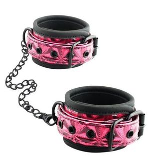 Наручники для сексуальных игр, изготовлены из кожзама, соединены между собой цепочкой с карабинами. Внутренняя часть изготовлена из мягкого материала для комфортного использования. Размер регулируется при помощи застежек. Ширина - 5,5 см. None