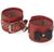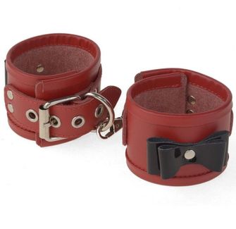 Аксессуар состоит из двух широких полос из плотной натуральной высококачественной кожи красного цвета, украшенных контрастными черными лаковыми объемными бантами, соединенных между собой снимающейся короткой сцепкой в виде карабинов. Оденьте наручники на запястья и с помощью никелированных пряжек зафиксируйте ремни. Ширина - 5,5 см. None