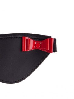 Маска на глаза закрытого типа из натуральной кожи черного цвета, украшенная красным лаковым бантом. Фиксирующая резинка позволяет легко регулировать размер изделия. Внутренняя часть имеет подкладку из велюровой бархатистой кожи. Ширина - 7 см. None