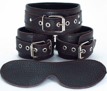 Интригующий набор из маски, ошейника, оков, выполненных из мягкой коричневой кожи, поможет окунуться во всю бездну эротических страстей. Ремни и металлические пряжки позволяют выбрать нужный размер, а также надежно зафиксировать аксессуары на теле. Кожаное соединение на карабине предоставляет выбор различных вариантов фиксации. Оковы подойдут на обхват от 18 до 26 см. Ошейник подойдет на обхват от 30 до 38 см. Маска на резинке. Длина соединения - 14 см.<br> Ширина оков - 6 см.<br> Ширина ошейников - 5 см. None