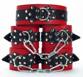 Набор состоит из наручников, оков и ошейника, выполненных из натуральной кожи красного цвета со вставками из черной кожи. Подклад из черного эко-меха нежно прилегает к телу. Декор в виде банта с металлическим кольцом посередине на каждом изделии придает пикантности для самых смелых фантазий. Все составляющие надежно фиксируются ремнями и металлическими пряжками, позволяющими выбрать нужный размер, наручники подойдут на обхват руки от 14 до 25 см. Ошейник подойдет на обхват от 28 до 37 см. Оковы подойдут на обхват от 16 до 26 см. Атрибуты можно скреплять по вашему желанию кожаными соединениями на карабинах. Ширина манжет - 6 см.<br> Длина соединений - 15 см. None