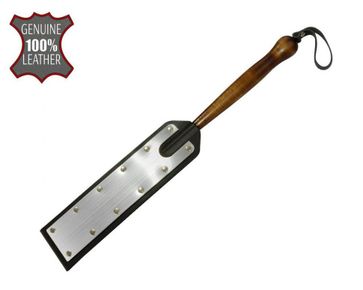 Шлепалка изготовлена из натуральной кожи и декорирована вставкой, имитирующей металл. С одной стороны ударная часть хлопушки имеет кожаную поверхность, с другой декоративную вставку. None