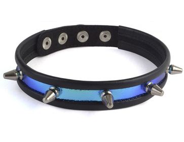 Узкий ошейник чокер из высококачественной натуральной кожи, украшенный вставкой из особого голографического материала цвета хамелеон и пятью серебристыми металлическими шипами. По краю ошейника проходит оторочка из черной кожи, обеспечивающая комфорт при ношении. Особенностью материала является то, что помимо синего, бирюзового и салатового, он способен принимать множество промежуточных оттенков. Ширина - 2 см. None