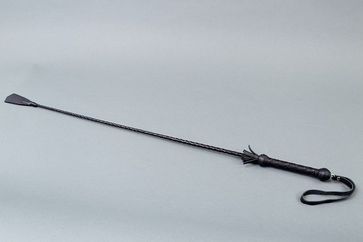 Стек состоит из гибкой основы,овитой натуральной кожей черного цвета,наконечника и удобной рукояти с петлей для надевания на руку (темляк). None