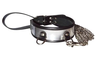 Ошейник изготовлен из высококачественной кожи черного цвета. По краю изделия проходит оторочка, обеспечивающая комфортное использование. Особенностью данной модели является вставка, имитирующая металл, которая придаёт изделию эффектности. Отрегулировать размер ошейника можно при помощи металлической пряжки. Вся металлическая фурнитура имеет никелевое покрытие. Ширина - 4 см.<br> Длина поводка - около 100 см. None