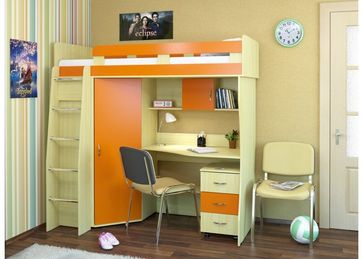 Детская комната Карлсон М1 - это кровать-чердак с рабочей зоной. Детский мебельный комплекс с фасадами на Ваш выбор добавит комнате вашего ребенка красок и настроения. Карлсон М1 - модульная мебель, комплект состоит из модуля с кроватью и шкафом (14.710), столешницы (14.710.06) и подкатной тумбы (14.301). Все модули входят в стоимость комплекса. Тумба укомплектована тремя удобными ящиками на металлических направляющих. Над столом расположена полка для книг. Шкаф угловой и вместительный, разделен пополам по вертикали. Одна половина со штангой предназначена для плечиков, вторая с полками - для верхней одежды. Лестница изготовлена из хромированных мебельных трубок и расположена с фасада кровати-чердака. Возможность "зеркальной" сборки - важное достоинство кровати-чердака Карлсон М1 с рабочей зоной. Корпус комплекса изготовлен из ламинированного ЛДСП – современного надежного материала, который не боится царапин и загрязнений. Толщина корпуса 16 милиметров, все торцы и углы элементов корпуса скруглены пластиковой кромкой фирмы«Rehau» (Германия), что повышает травмобезопасность. При сборке комплекса используется надежная импортная фурнитура. Благодаря простоте сборки и подробной инструкции комплекс легко собрать самостоятельно в домашних условаях. Комплекс поставляется в разобранном виде упакованным в прочный картон. При желании на нашем сайте вы также можете подобрать для вашего ребенка подходящии матрас. Характеристики: