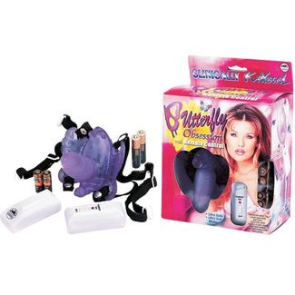 Клиторальный вибростимулятор на эластичных ремешках BUTTERFLY OBSESSION. Вибромассажер в виде бабочки с фаллоимитатором. Крепится к телу эластичными, регулируемыми ремешками. Мощный мини-электромотор с дистанционным пультом управления. Длина фаллоса - 5 см., диаметр - 2 см. None