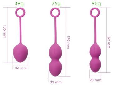 В этом наборе сочного фиолетового цвета есть всё необходимое для выполнения упражнений Кегеля. Три вида вагинальных шариков, отличающихся друг от друга количеством и размером звеньев, помогут вернуть мышечной стенке вагины силу и упругость. <br><br> Прелесть этого набора в том, что вы можете подобрать тренажёр для ситуации здесь и сейчас. Предстоит пробежка? Можно взять одиночный шар. Работа такая, что весь день придётся провести на ногах? Тогда удобнее будут двойные шарики малого размера. <br><br> Бархатистая и идеально гладкая поверхность из медицинского силикона способствует лёгкому введению стимуляторов и комфортному ношению. Длинные мягкие хвостики с колечком помогут извлечь тренажёр из лона после выполнения всех упражнений. Длина одиночного шарика - 13,5 см., диаметр - 3,6 см, вес - 49 гр.<br> Длина малых двойных шариков - 16,2 см., диаметр - 2,8 см, вес - 95 гр.<br> Длина больших двойных шариков - 17 см., диаметр - 3,2 см, вес - 75 гр.<br> None