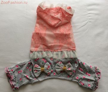 Стильный комбинезон из тонкого трикотажа, с капюшоном. На спинке красивые банты. Одевается через голову. None