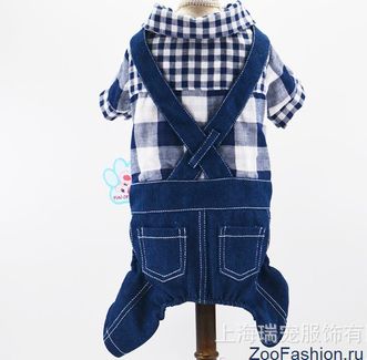 Элегантный прогулочный костюм для собаки - хлопковая рубашка в клетку и мягкие джинсовые брюки. Отлично сидит на собаке. Застегивается на кнопки на груди. None