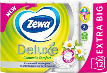 - Zewa Deluxe Camomile Comfort 12 рулонов в упаковке 3 слоя по выгодной цене 759 р. руб.;