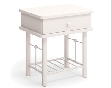 Прикроватная тумба с элементами ковки. Основание выполнено из металла в белом цвете. Столешница - ЛДСП. Тумба оснащена выдвижным ящичком для хранения. Тумба отлично подходит к кованым кроватям, таким как Венера, Фортуна, Селена.