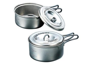 <h2>Компактные и очень легкие титановые кастрюли</h2> <p><ul> <li>Кастрюли компактно складываются друг в друга.</li> <li>Складные ручки с силиконовым покрытием не нагреваются.</li> <br> <li>Материал: титан</li> <li>Объем: 600 + 900 мл</li> <li>Размер: 12.4 х 5.2 см, 13.6 х 6.4 см</li> <li>Вес: 95 + 115 г</li> </ul></p> None Можно купить без предварительного заказа. Возможен самовывоз. Есть доставка.