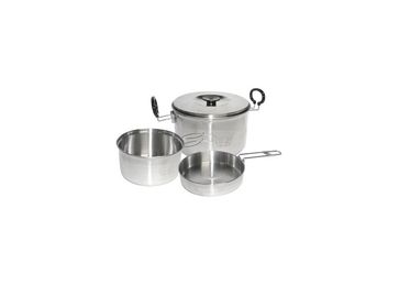 <h2>Набор посуды на 2-3 персоны</h2> <p><ul> <li>Кастрюля с крышкой на 4 литра.</li> <li>Кастрюля с крышкой на 2,5 литра.</li> <li>Сковорода.</li> <li>Чехол для хранения.</li> <br> <li>Материал: нержавеющая сталь</li> <li>Размер: 18 х 11 см</li> <li>Вес: 760 г</li> </ul></p> None Можно купить без предварительного заказа. Возможен самовывоз. Есть доставка.