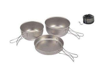 <h2>Набор титановой посуды.</h2> <p><ul> <li>Комплект включает:<ul> <li>2 кастрюли (720 и 570 мл)</li> <li>сковорода для жарки</li> <li>нейлоновый чехол.</li></ul></li> <li>Материал: титан </li> <li>Вес: 200 г</li> </ul></p> None Можно купить без предварительного заказа. Возможен самовывоз. Есть доставка.