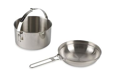 <h2>Котелок - это не кастрюлька с крышкой. Котелок - это и не сковородка. Котелок - это то и другое одновременно.</h2> Так же универсален, как и возможности его использования. <h3>Особенности:</h3><ul> <li>Комплектация:<ul> <li>Кастрюля: 16,5x9 см / 280г / 1,6 л</li> <li>Сковородка: 17,5x4 см / 165 г</li></ul></li> <li>Материал: Stainless Steel 18/8</li> <li>Набор посуды: 2 предмета.</li> <li>Размер: 17,5х11,5 см</li></ul><br> <p>Вес: 445 г.</p> None Можно купить без предварительного заказа. Возможен самовывоз. Есть доставка.