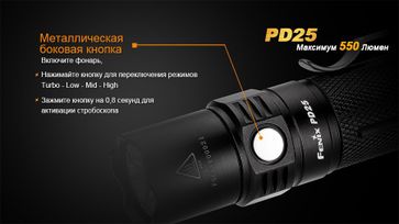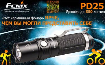 Fenix PD25 - Это светодиодный фонарь для туристов, велосипедистов и отдыха на природе. В его схемотехнике применен новейший светодиод Cree XP-L V5, благодаря ему, Феникс PD25 способен развить световой поток до 550 люмен и обеспечить дальность освещения до 130 метров в режиме Турбо, фонарик способен работать до 100 часов от одной батарейки в минимальном режиме. И это намного больше, чем можно ожидать от такой крошечной модели!