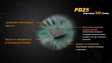 Фонарь Fenix PD25 оснащён защитой от перегрева, она предохраняет светодиод и электронные компоненты от выхода из строя. Кроме этого, электроника защищает фонарь от короткого замыкания и неправильной установки батарей (несоблюдения полярности элементов питания). Для удобства использования он запоминает последний выбранный режим яркости и включается в том режиме, в котором был выключен, даже после замены элементов питания. Кнопка включения / выключения расположена в торцевой части, она тактического типа допускает бесшумное моментальное включение неполным нажатием на кнопку и её удержанием. Переключение режимов осуществляется специальной кнопкой в головной части фонаря, что очень удобно.