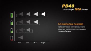 Универсальный фонарь Феникс PD40 снабжен всего одной кнопкой, которая расположена в головной части фонаря и при стандартном хвате оказывается под большим пальцем. Надавливание до упора и удержание кнопки в течение 0,5 секунды включает и отключает осветительное прибор. Для комфорта использования, фонарь PD40 запоминает последний использованный режим и включается в том же режиме, в котором работал в момент предыдущего применения, даже после замены элемента питания. Короткое нажатия, на эту же кнопку, во включенном режиме, меняет уровень яркости фонаря Fenix PD40. Режим Турбо-Burst служит для мгновенного увлечения яркости и дальности фонаря в 1,8 раза, для его активации необходимо удерживать кнопку нажат
