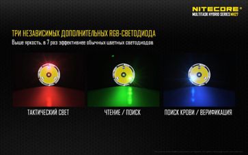 В фонаре NiteCore MH27 используется та-же технология, позволяющая светить красным, зеленым и синим светом, что и в фонаре Nitecore SRT7. Ее суть заключается в том, что в разработанный по последним технологиям алюминиевый отражатель, помимо основного светодиода, встраиваются три дополнительных цветных LED кристалла. Стоит отметит, что фонарь MH27, это первое изделие НАЙТКОР в серии Multitask Hybrid, сделанное по этой технологии.