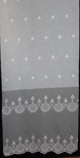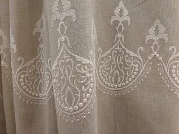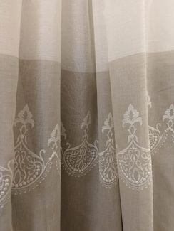 Полупрозрачная тюлевая ткань с основой под лен двухцветная (низ - цвет льна, верх-молочный), украшенная аккуратной белой вышивкой в классическом стиле. Увеличенная высота ткани - 320 см, исполнение в стиле эко и не избитый дизайн делают данную модель очень актуальнйо для текстильного оформления загородных домов. Часто используют самодостаточно, без портьер.Высота ткани 320 см.Ширина ткань может быть любой по вашему желанию.Возможен пошив штор по вашим размерам. None