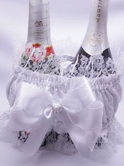 Украшения на бутылки с шампанским Gilliann Ice Lady GLS071 Украшение на бутылки с шампанским - часть комплекта Ice Lady. Сделано из белого атласа с кружевной отделкой, украшено бантом с жемчугом. Материал: атлас, жемчуг, кружево. None
