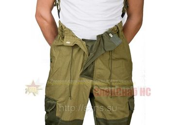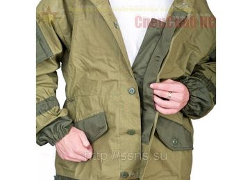 Горный летний ветрозащитный костюмгрязно землисто-серого цвета с зеленоватым оттенком, хорошо маскирующим в условиях горно-лесистой местности, как в летний, так и в осенне-зимний периоды.Костюм горныйпредназначен для защиты от резких перепадов температур и сильного ветра в условиях горной местности. Комплект костюма включает куртку-парку и брюки. Куртка-парка свободного покроя длинной до середины бедер позволяет, в зависимости от сезона, поддеть под куртку дополнительные слои одежды. Объем куртки регулируется резинотканевой тесьмой по бокам на талии и шнуром в кулисе низа. Для лучшей защиты от ветра, куртка застегивается пуговицами на две ветрозащитные планки, расположенные с внутренней и внешней стороны левой полочки. Такое расположение планок, полностью «отсекает» поток холодного воздуха с любой стороны. Чтобы пуговицы не цеплялись заснаряжение, внешняя планка закрывается бортом левой полочки. Капюшон застегивается на подбородке клапаном на пуговицах, оснащается козырьком и регулируется по объему шнурами в кулисах. Низ рукавов регулируется резинотканевой тесьмой. Куртка шьется из плотной х/б ткани полотняного плетения, используемой для производства палаток, и усиливается на локтях вторым слоем смесовой ткани. На полочках располагаются боковые прорезные карманы с пылезащитными клапанами, застегивающимися на пуговицу. Чтобы клапан быстро не износился, при частом пользовании карманом, на подкладку идет смесовая ткань. Брюки свободного покроя, также как и куртка-парка позволяют надеть дополнительные слои одежды. Для того чтобы свободные брюки не «парусили» при сильном ветре, затрудняя движение, под коленями и внизу располагаются стяжки из резинотканевой тесьмы. Брюки оснащаются шестью карманами: двумя «портфельными», набедренными (с клапанами, застегивающимися на пуговицы), двумя задними прорезными с клапанами, двумя б