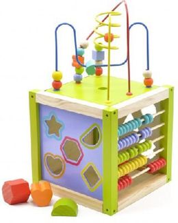 Многофункциональный развивающий центр для детей 1-6 лет. Деревянный куб содержит логические развивающие игрушки: проволочный лабиринт, счеты, сортер с геометрическими фигурами, часики. Игровые возможности: