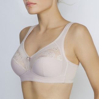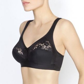 Классический бескаркасный бюстгальтер с мягкой чашкой, для большой полнотной группы. Нижняя часть чашек и пояс спереди ламинированы хлопком, что придает стабильность и комфорт, как поддерживая грудь, так и улучшая гигроскопичность при носке. Внутренние швы обработаны мягкой отделочной тесьмой, что позволяет швам не натирать чувствительную кожу. Для комфорта, и в то же время придания легкости и ажурности бюстгальтера, не эластичное кружевное и стабильное полотно, продублировано прозрачной сеткой. Поддерживающий элемент подмышечной зоны с выходом на бретель оформлен с расширением на плече и дополнительно продублирован поролоном. Вертикальные косточки на боковых панелях, не дают ткани скрутиться на больших размерах. None