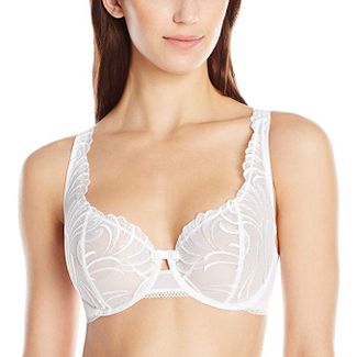 Элегантный бюстгальтер с мягкими чашками, на каркасах. Чашки из тюля с изысканной вышивкой в виде перьев, переходящие на бретели. Вертикальная вытачка на чашках, и подкладка из неэластичной ткани в сетку, обеспечивают безупречные посадку и поддержку. Широкая центральная панель декорирована вырезом-капелька, украшенным бантиком. Двухслойные боковые панели из микрофибры и ткани в сетку соединенны внутренними швами. Бретели не тянутся спереди, и становятся эластичными на спинке. None