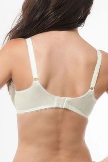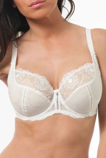 Бюстгальтер-балконет с мягкими чашками на каркасах. Эта модель, с вертикальной вытачкой в нижней части чашки, по праву считается произведением искусства. Вытачка сделана техникой «мережка» и, благодаря ей, бюстгальтер выигрышно приподнимает грудь. Декоративные вставки из кружева «Шантильи» делают декольте роскошным. Бретели с изящными фестонами и крохотная пуговка из натурального перламутра, дополнительно подчеркивают изящество этой модели. None