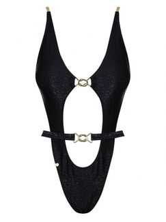 Вэтом купальнике вы будете выглядеть восхитительно, нежно, чувственно и в то же время немного игриво. Вы почувствуете себя красивой и полностью очаруете своего мужчину. Регулируемые бретели золотистого цвета. Пятнистый узор - красиво смотрится на черной ткани. Тонкие золотистые украшения. Купальник выглядит как раздельное бикини сзади. Дерзкий низ в форме стрингов. Сверхмягкий и эластичный материал. None