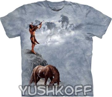 Футболка с изображением индейца на фоне лошадей.