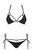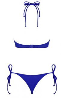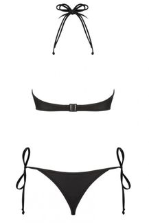 Эффектный купальник-бикини, где акцент сделан не на вычурных элементах, а на стильном дизайне. Плавки с очень низкой посадкой дополнительно декорированы блестящей металлической перемычкой и стреп-лентами. Лиф отчасти повторяет главный мотив трусиков: здесь тоже используются переплетения узких лент. Плавки завязываются на бедрах, а лиф – на шее. Готовый комплект смотрится сексуально, притягивает внимание необычным фасоном. Особенно выгодно подчеркивает грудь и нижнюю линию живота. В комплекте: лиф, трусики. None