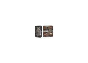 Компактный и стильный. Размером не более обычного кошелька. Футляр кожа, защёлка автомат. Внутренняя отделка футляра - мягкий велюр, имитация замши, цветом в тон коже футляра. Состоит из 5 предметов. Футляр с высокими бортиками, толщина набора 2 см. Размер: 11,5х7см Выпускается с разным покрытием инструментов: золото (G),серебро S, матовое серебро (SM), Черный жемчуг(BP). При заказе уточняйте цвет у менеджера.