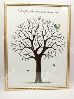Свадебное дерево пожеланий DRP031 Каждое мгновение счастливого дня свадьбы хочется запомнить навсегда. Теперь важные свадебные слова не обязательно хранить в памяти, ведь для этого есть замечательное дерево пожеланий. Аксессуар представляет из себя высококачественную печатную картину, заключенную в красивую рамку со стеклом. Фантазийное дерево не имеет листвы, вместо нее на ветвях должны появиться многочисленные отпечатки приглашенных на свадьбу. Для этого используются подушечки с краской, в которые гости обмакивают пальцы. Далее гости оставляют свои отпечатки на дереве и пишут пожелания. Можно попросить авторов указать свои имена или оставить эту информацию в секрете. Пусть молодожены по отпечаткам пальцев попробуют угадать, кому принадлежит каждое пожелание! Свадебное дерево DRP031 декорировано изображением двух птичек, которые символизируют новоиспеченных супругов. Размеры: 30 х 40 см В комплект входит: 1. Рамка со стеклом (можно выбрать рамку на выбор). 2. Картина дерева пожеланий на плотном картоне. 3. Две штамп-подушечки (цвета в ассортименте, можно выбрать цвета) для отпечатков пальцев. 4. Ручка для подписей гостей. None
