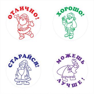 "Отлично" - красный оттиск, "Хорошо" - зелёный оттиск, "Старайся" - синий оттиск, "Можешь лучше" - фиолетовый оттиск.