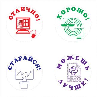 "Информатика" - Комплект автоматических печатей GRM 4925 Office, для школы. Комплект оценочных печатей для школы с тематическим изображением - "Информатика". В комплекте четыре печати, д. 24 мм.: "Отлично" - красный оттиск, "Хорошо" - зелёный оттиск, "Старайся" - синий оттиск, "Можешь лучше" - фиолетовый оттиск. Пример оттисков: Необходима предоплата. Visa/Mastercard, б/н расчет Можно купить без предварительного заказа. Возможен самовывоз. Есть доставка.