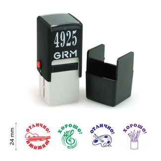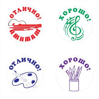 "ИЗО и музыка" - Комплект автоматических печатей GRM 4925 Office, для школы. Комплект оценочных печатей для школы с тематическим изображением - "Музыка и ИЗО (Искусство запечатления образа)". В комплекте четыре печати, д. 24 мм.: "Отлично" - красный оттиск, "Хорошо" - зелёный оттиск, "Старайся" - синий оттиск, "Можешь лучше" - фиолетовый оттиск. Пример оттисков: Необходима предоплата. Visa/Mastercard, б/н расчет Можно купить без предварительного заказа. Возможен самовывоз. Есть доставка.