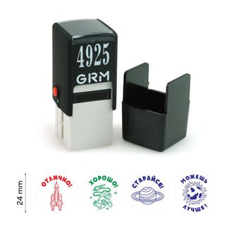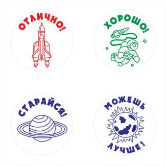 "Космос" - Комплект автоматических печатей GRM 4925 Office, для школы. Комплект оценочных печатей для школы с изображением планет, ракеты и космонавта - "Космос". В комплекте четыре печати, д. 24 мм.: "Отлично" - красный оттиск, "Хорошо" - зелёный оттиск, "Старайся" - синий оттиск, "Можешь лучше" - фиолетовый оттиск. Пример оттисков: Необходима предоплата. Visa/Mastercard, б/н расчет Можно купить без предварительного заказа. Возможен самовывоз. Есть доставка.
