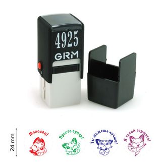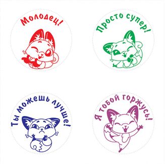 Комплект автоматических печатей для школы «Лисички», 4 цветных печати, д.24 мм, Тип-35 Комплект оценочных печатей для школы с рисунком, на автоматической оснастке GRM 4925 В комплекте четыре печати диаметром 24 мм. «Отлично!» - красный оттиск«Хорошо!» - зелёный оттиск«Старайся!» - синий оттиск«Можешь лучше!» - фиолетовый оттиск Пример оттисков: