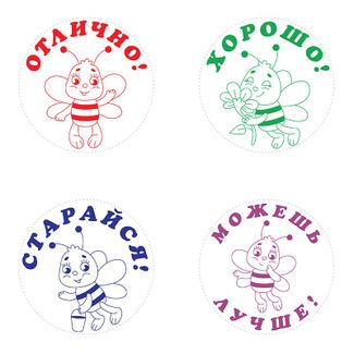 "Отлично" - красный оттиск, "Хорошо" - зелёный оттиск, "Старайся" - синий оттиск, "Можешь лучше" - фиолетовый оттиск.