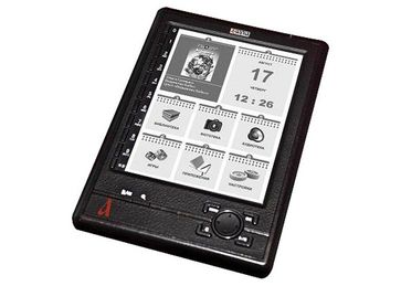 электронная книга с ч/б экраном 5", электронная бумага E-Ink Vizplex, разрешение 600x800 пикс., 8 оттенков серого, текстовые форматы: fb2, ePub, DjVu, TXT, PDF, RTF, PalmDOC, встроенный mp3-плеер, карты памяти Secure Digital, Secure Digital HC None