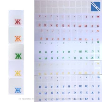 Наклейки на клавиатуру прозрачные из выскокачественного материала (Германия). Символы нанесены на внутренний клеящий слой. Матовое покрытие не бликует, символы не стираются. Очень качественно клеятся и служат многие годы (требуется предварительное обезжиривание поверхности клавиш). Только кирилица и знаки препинания. Цвета символов: красный (для белых клавиатур), сине-голубой, оранжевый, желтый, белый и зеленый. Уточняйте наличие цветов заранее. 11x13 мм оплата нал, безнал с НДС Возможен самовывоз. Есть доставка.